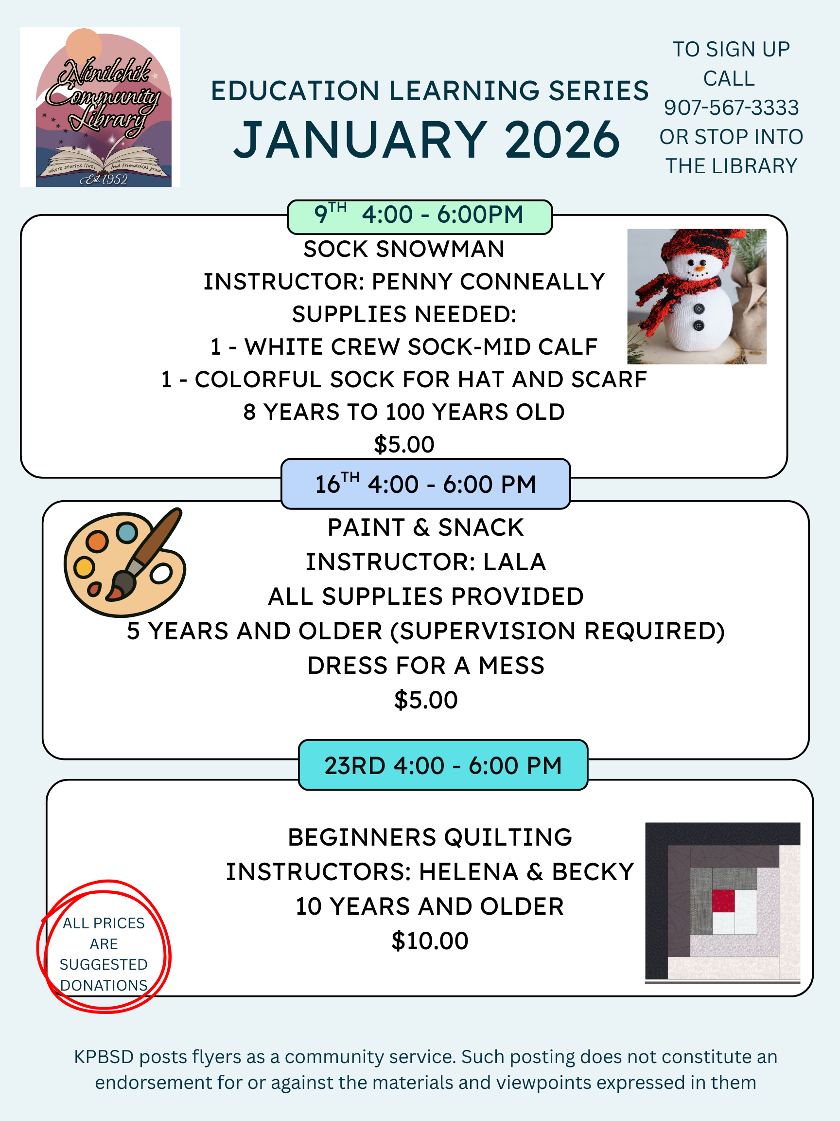 Any fees associated with these classes may be covered by homeschool allotments, if applicable. More details on dates, instructors, and registration will be shared as they are finalized. Thank you for supporting the Ninilchik Community Library. Whether you’re visiting us in person or online, we’re glad you’re here and look forward to seeing you at one of our upcoming programs!