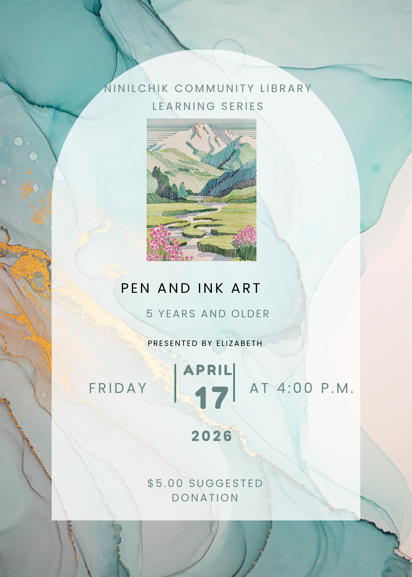 Explore the art of pen and ink in this hands-on Learning Series workshop at Ninilchik Community Library! Presenter Elizabeth will guide participants through the basics of this classic drawing technique — perfect for beginners and curious creators of all skill levels. Open to ages 5 and older. Join us Friday, April 17, 2026 at 4:00 p.m. A $5.00 suggested donation is appreciated.
