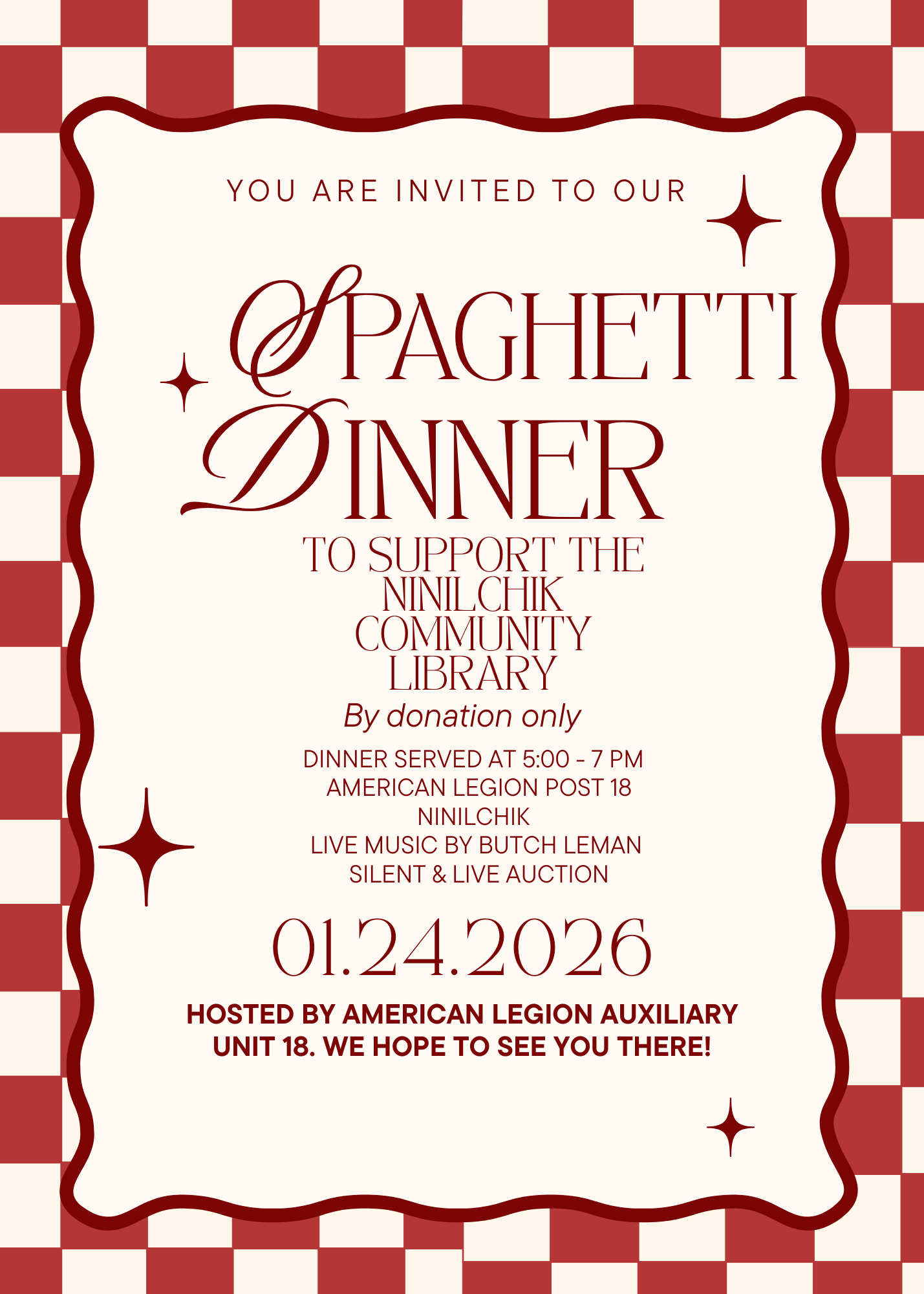 A dinner will be held at the american legion here in Ninilchik with proceeds to benefit the library.