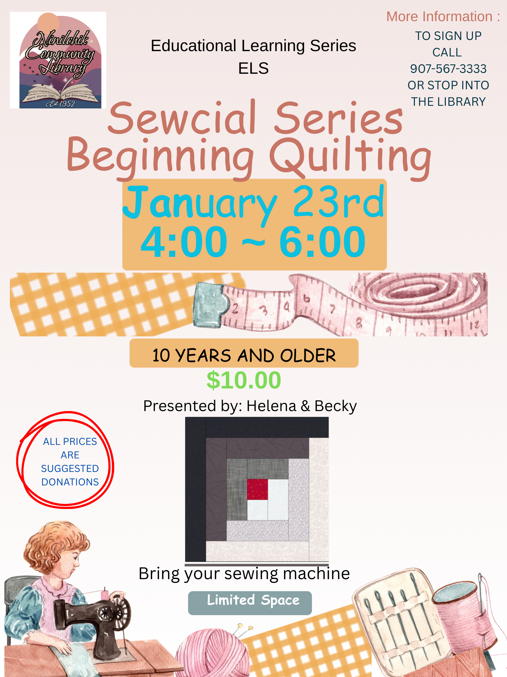 Please join us for a beginning sewing class. Helena and Becky will be your instructors for this class. Space limited. Bring your sewing machine if you have one.